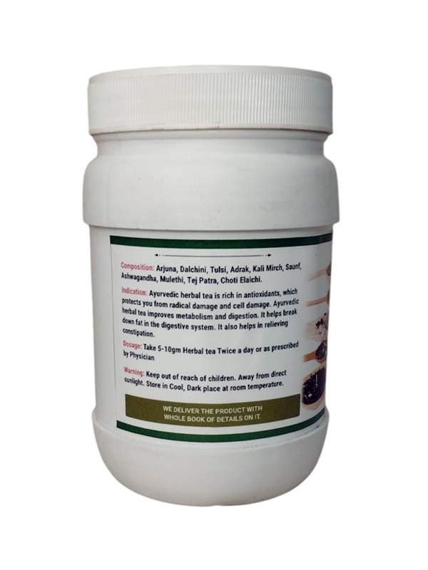 Ayurvedic Herbal Tea is a combination of herbs and spices and this combination is names it herbal tea. Ayurvedic Herbal tea is made with pure herbs Arjuna, Dalchini, Tulsi, Adrak, Kali mirch, Saunf, Ashwagandha, Mulethi, Tej Patta, Choti Elaichi. All this herbs and spices are very rich elements for keeping your metabolism up to the mark and keeps your digestive system fit and fine.